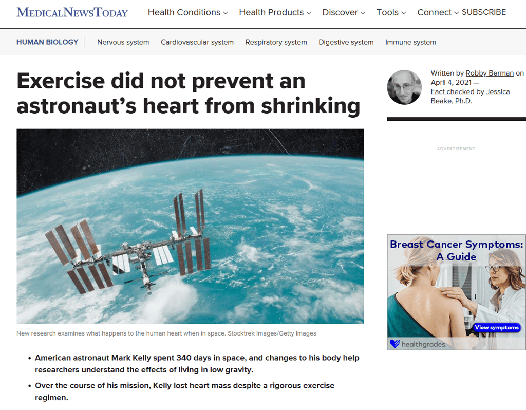 Kelly’s heart shrank by an average of 0.74 grams per week during the year he spent in space, although the muscle continued to perform well.