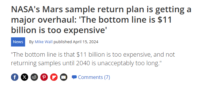 NASA is having great difficulty returning Mars soil samples to Earth for a "fair price."